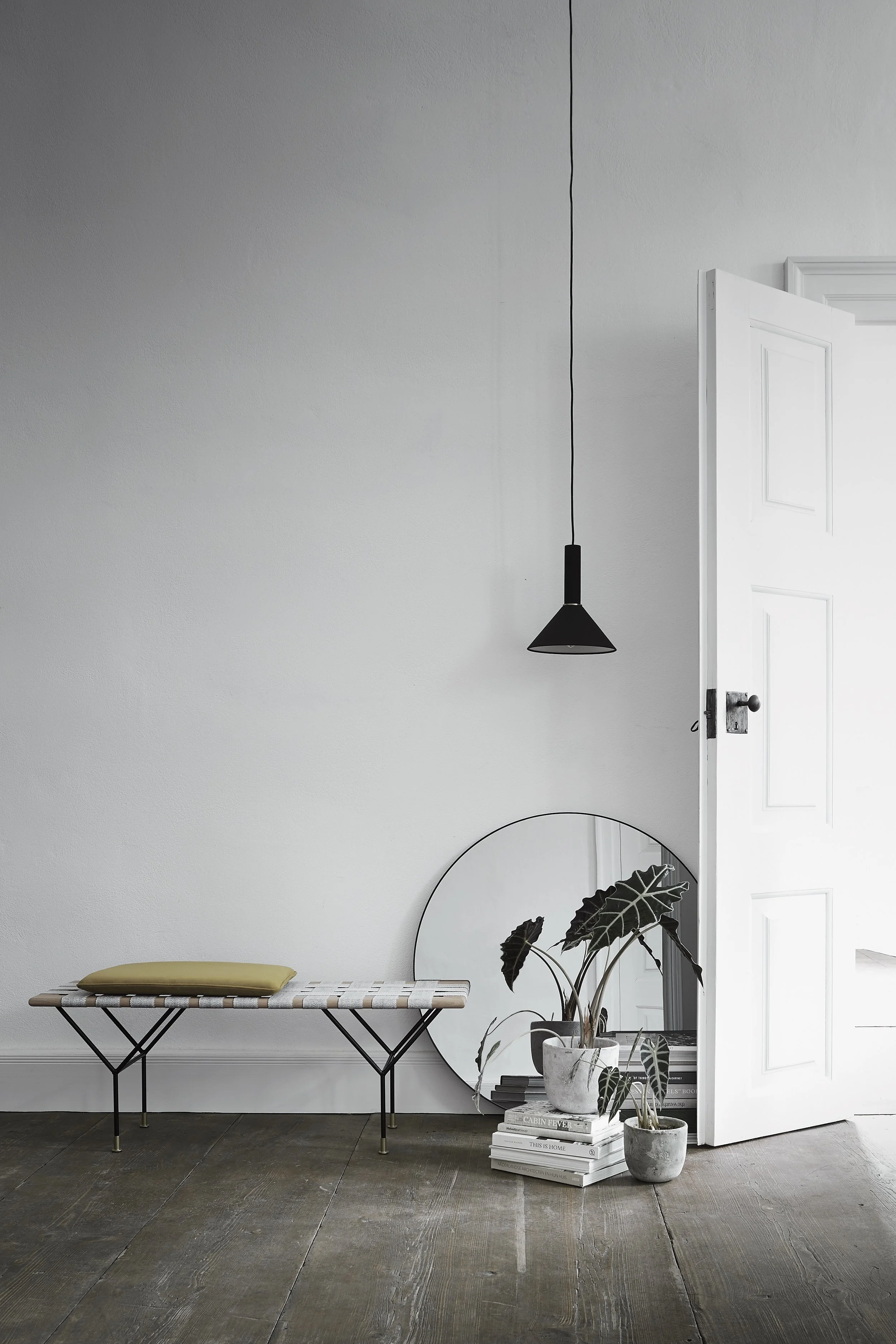 Eine Bank, die mehr kann als nur Sitzfläche sein. Die Mugge, entworfen von unserer Gründerin Inke Fürbeth, bringt Leichtigkeit in den Raum: textile Bänder als tragende Struktur, ein reduziertes Kissen für Komfort, filigrane Metallfüße für Stabilität.